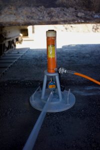 Med hjälp av domkraften som är kopplad till en pumpcylinder skapas ett statiskt tryck mot grunden. Trycket på flera ton gör att plattan pressas ner mot marken och sättningsmätaren mäter sättningen, d.v.s. hur djupt plattan sjunker ner i grunden under olika tryckförhållanden.